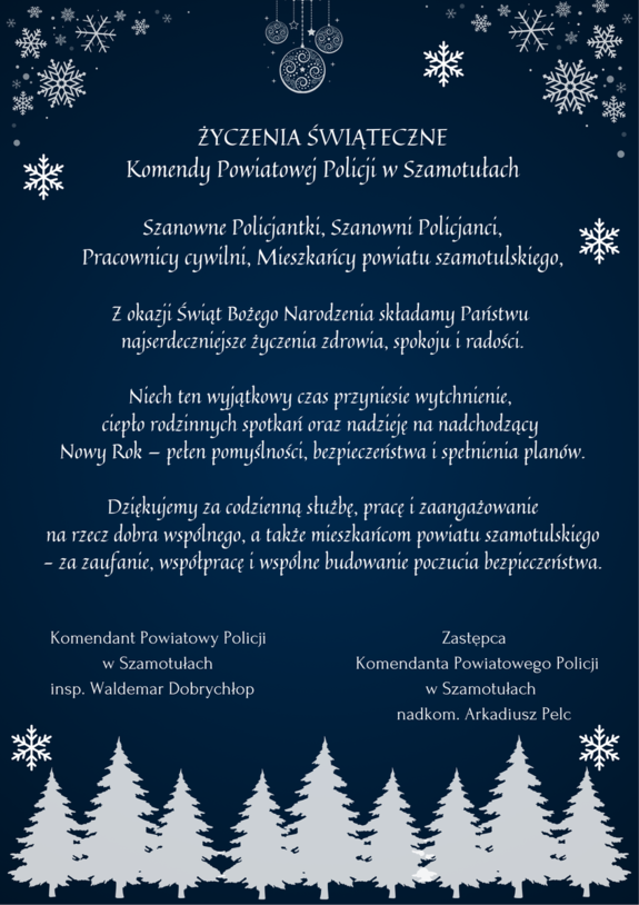 Z okazji Świąt Bożego Narodzenia i Nowego Roku Komendant Powiatowy Policji w Szamotułach insp. Waldemar Dobrychłop w imieniu własnym i kierownictwa szamotulskiej Policji składa życzenia wszystkim policjantkom, policjantom, pracownikom Policji, mieszkańcom powiatu szamotulskiego.