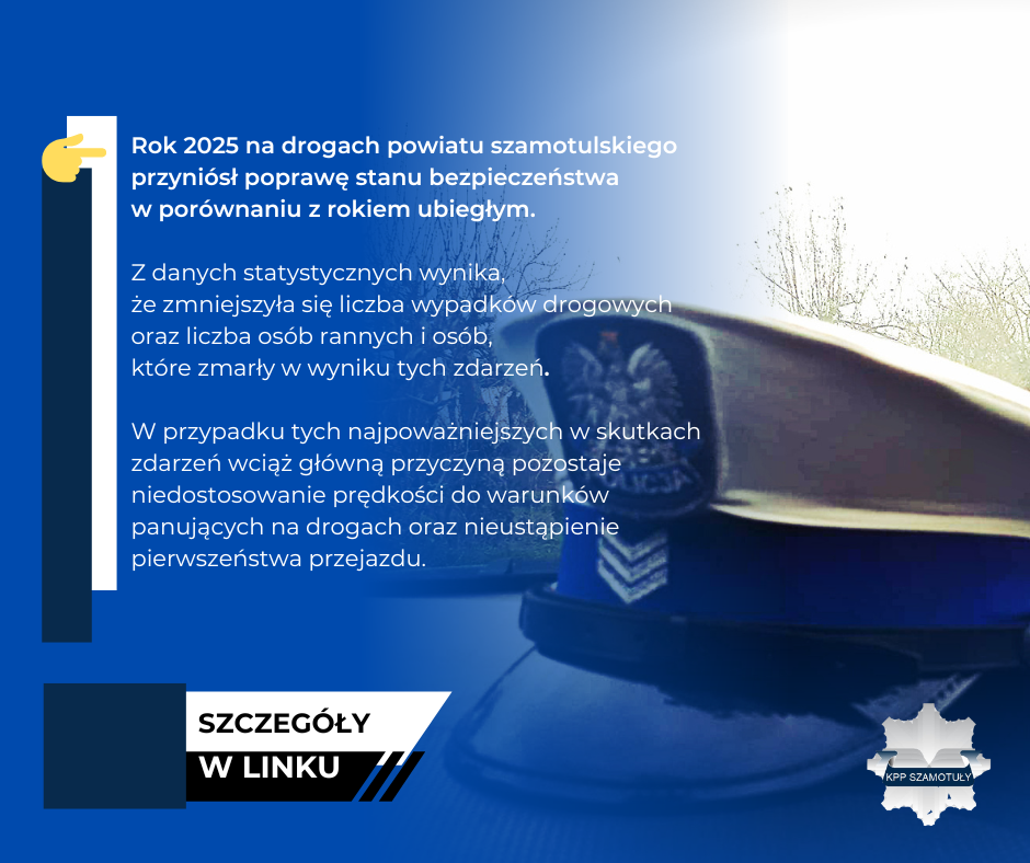 Rok 2025 na drogach powiatu szamotulskiego przyniósł poprawę stanu bezpieczeństwa w porównaniu z rokiem 2024. Z danych statystycznych wynika, że zmniejszyła się liczba wypadków drogowych oraz liczba osób rannych i osób, które zmarły w wyniku tych zdarzeń. Nadal znaczną część wszystkich zdarzeń stanowią kolizje drogowe spowodowane błędami kierujących.