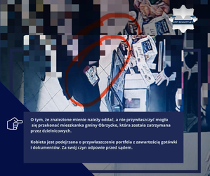 Dzielnicowi zweryfikowali uzyskane informacje. W markecie, w którym miało dojść do przestępstwa sprawdzili nagrana z monitoringu na którym widać było kobietę, podejrzaną o przywłaszczenie mienia. Została rozpoznana przez jedną z pracownic, a portfel widniejący na nagraniu został rozpoznany przez zgłaszającego.