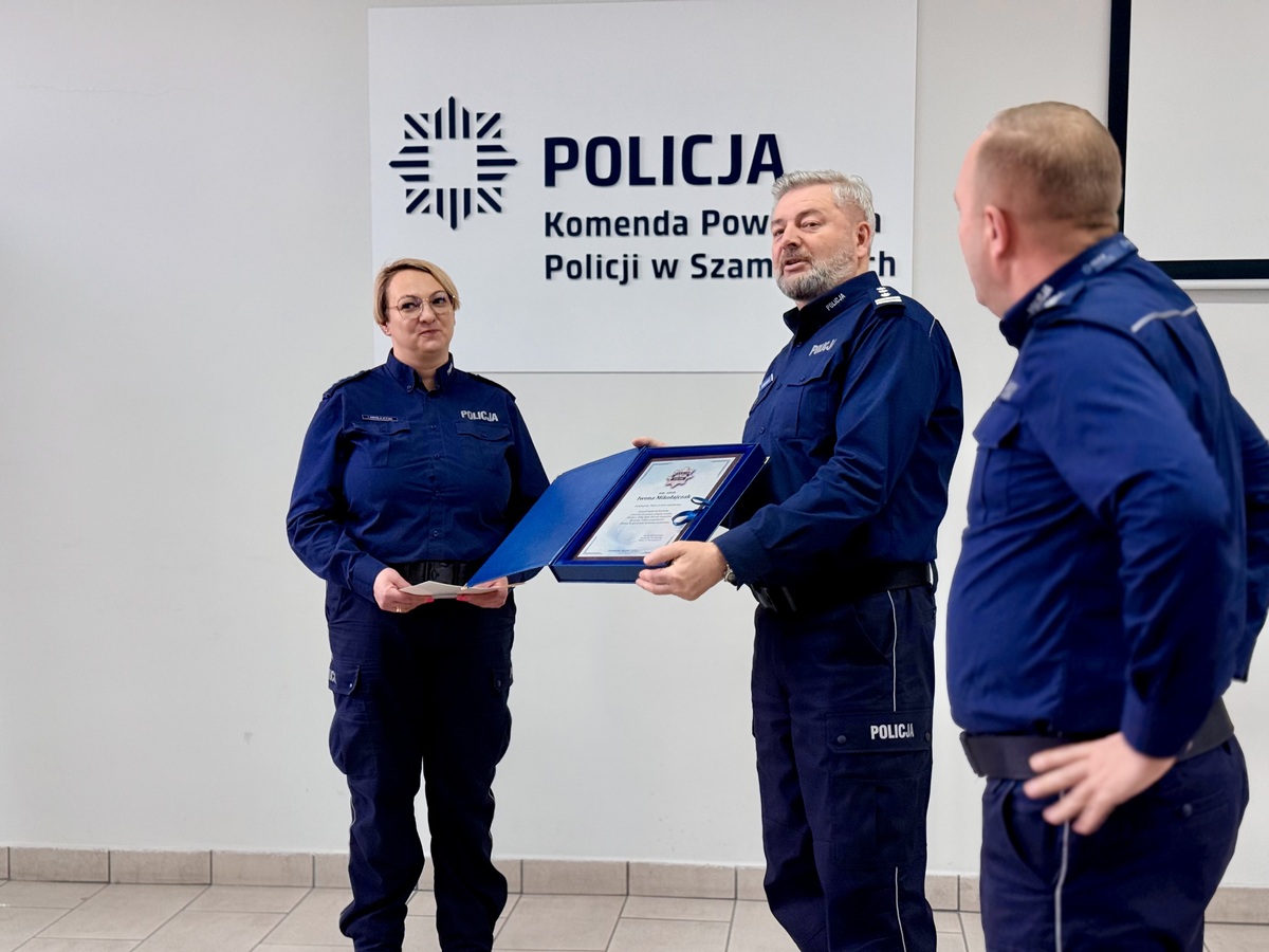 Komendant Powiatowy Policji w Szamotułach pogratulował obu policjantkom awansu oraz podziękował za dotychczasową współpracę. Asp. szt. Iwona Mikołajczak została uhonorowana medalem Komendanta Powiatowego Policji w Szamotułach w uznaniu za osiągnięcia zawodowe oraz wieloletnią, rzetelną służbę na rzecz Komendy Powiatowej Policji i bezpieczeństwa mieszkańców powiatu.