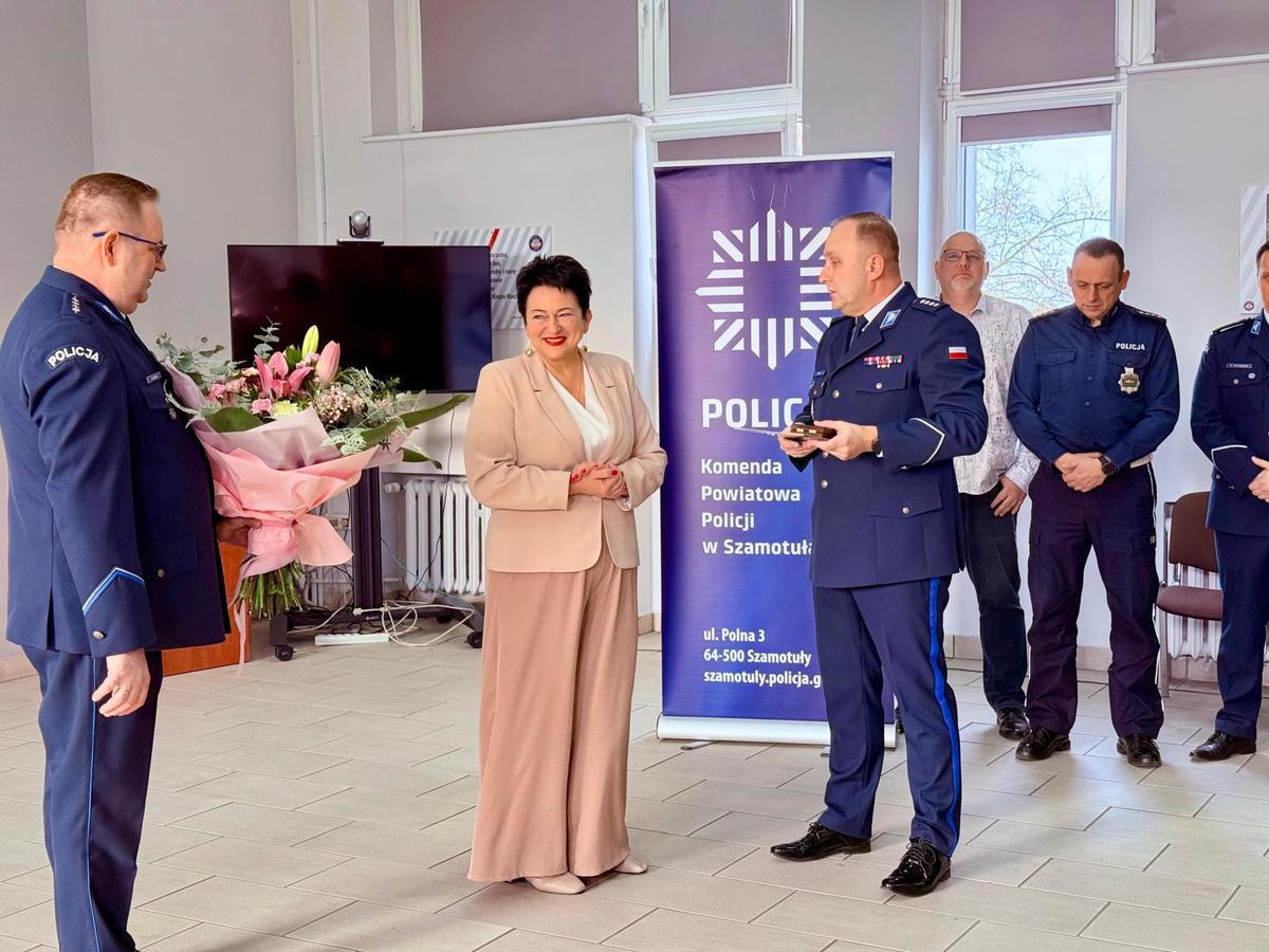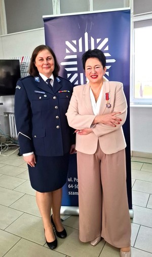 Do podziękowań i gratulacji dołączyła się również Przewodnicząca ZT NSZZ Policjantów KPP Szamotuły podkom. Izabela Kowzan-Budych. Decyzją Przewodniczącego ZW NSZZ Policjantów z dnia 16 stycznia 2026 roku za zasługi na rzecz Niezależnego Samorządnego Związku Zawodowego Policjantów oraz wielkopolskiej Policji Pani Helenie Pospiesznej nadano Brązowy Medal NSZZ Policjantów województwa wielkopolskiego.