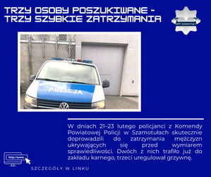 W dniach 21–23 lutego funkcjonariusze z Komendy Powiatowej Policji w Szamotułach zatrzymali trzy osoby poszukiwane przez wymiar sprawiedliwości.