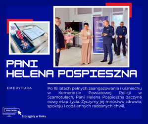 W Komendzie Powiatowej Policji w Szamotułach odbyło się uroczyste pożegnanie Pani Heleny Pospiesznej, wieloletniej pracownicy cywilnej, która po 18 latach pracy przeszła na zasłużoną emeryturę.